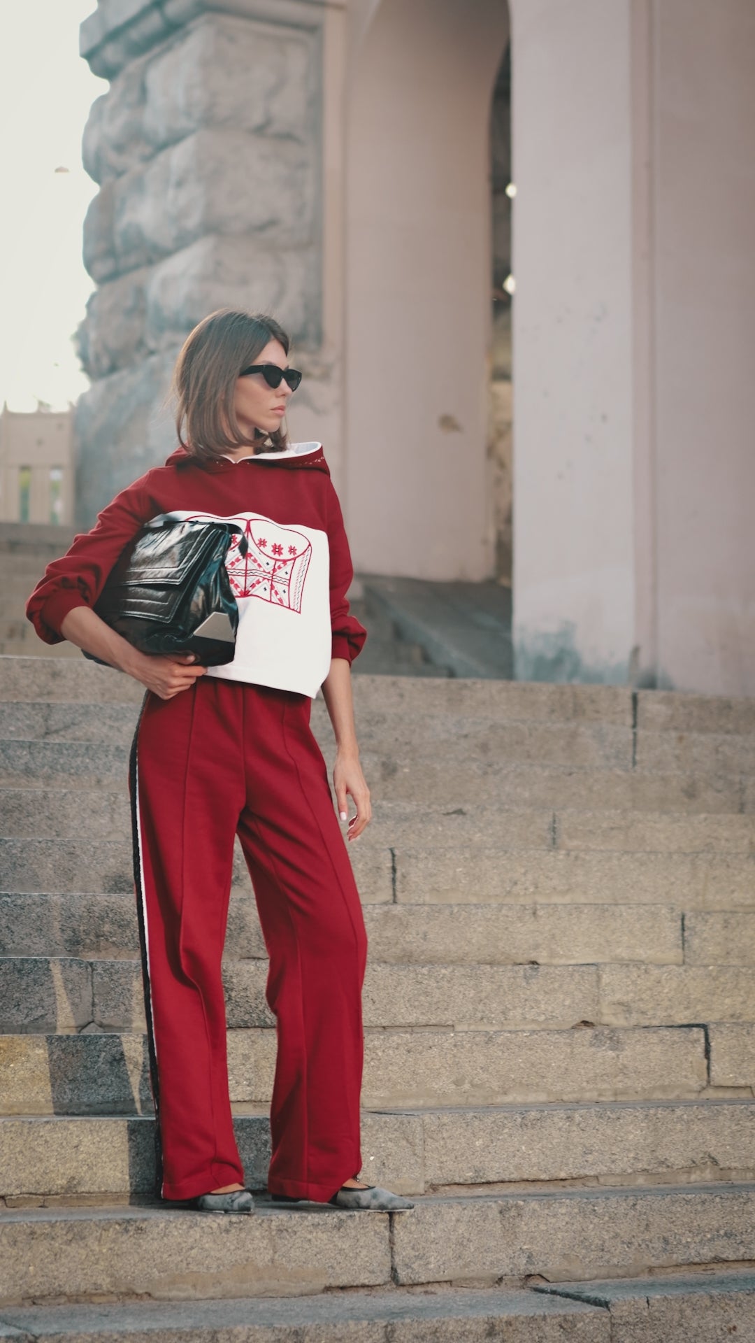 The trousers feature a straight, relaxed cut, offering comfort and freedom of movement. A subtle embroidered side stripe echoes the central motif, creating a cohesive visual dialogue across the set. The deep burgundy tone adds nobility and depth, while decorative stitching on the hood enhances the character of the hoodie.
