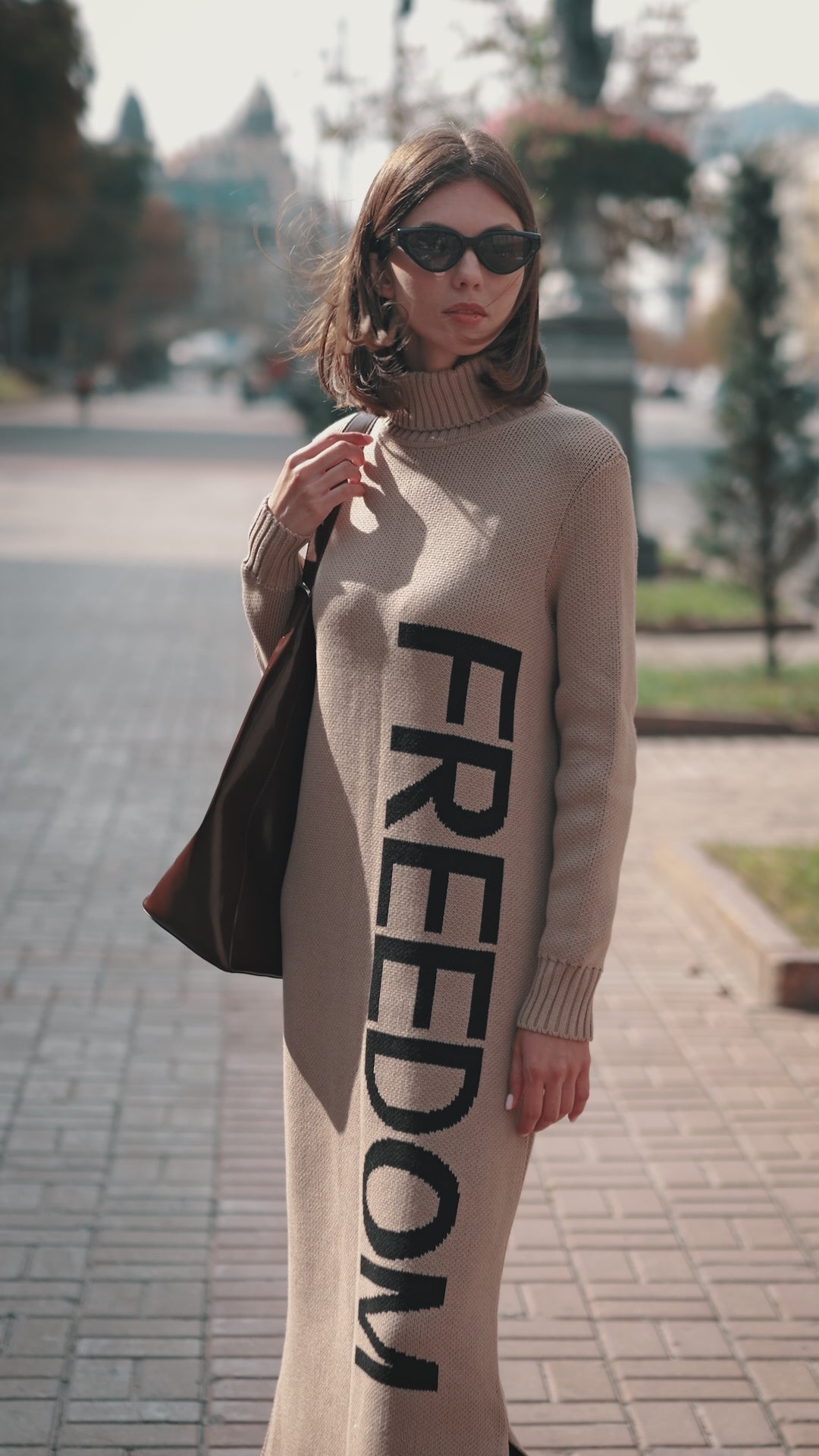 Crafted from a warm wool-blend knit, this dress gently hugs the figure while allowing space to breathe and move. The high neckline adds a sense of protection and composure, while the elongated vertical FREEDOM inscription visually stretches the silhouette, turning the message into a structural element of the design.