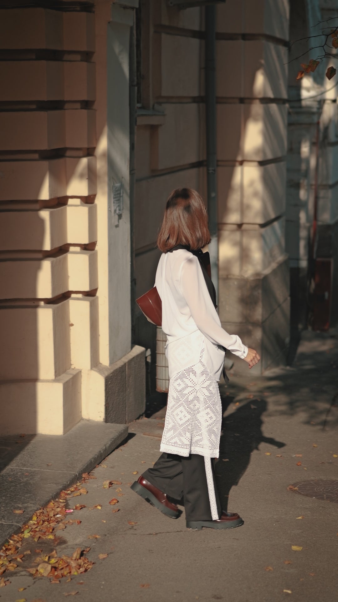 Black trousers with white cotton lace inserts along the sides are complemented by a handmade crocheted zapaska — a striking accent that adds character and cultural depth to the silhouette. Traditionally worn as a protective and decorative element, the zapaska here is reimagined as a modern statement piece.