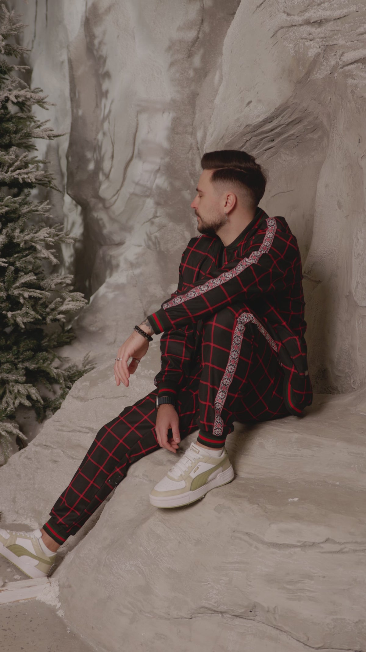 This modern men’s suit carries a Ukrainian code expressed through restraint, not excess. A clean tailored silhouette is balanced with a subtle graphic check pattern, while ethnic ornaments along the sleeves and trousers act as a quiet sign of continuity — not decoration, but meaning.